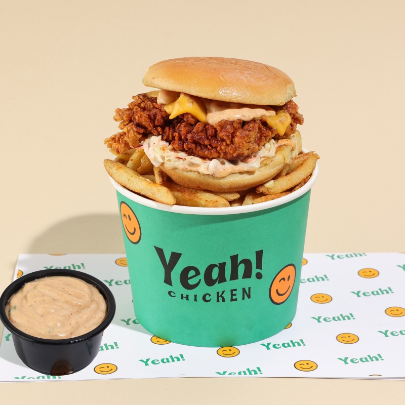 (1009 سعرة حرارية)خبز برغر طري بحشوة دجاج مقرمش ناشفيل الحار، شريحة جبنة، صوص ناشفيل مضافاً إليه البيكلز الحلو يقدم مع بطاطس مقليه مبهره و سيغنتشر صوص.